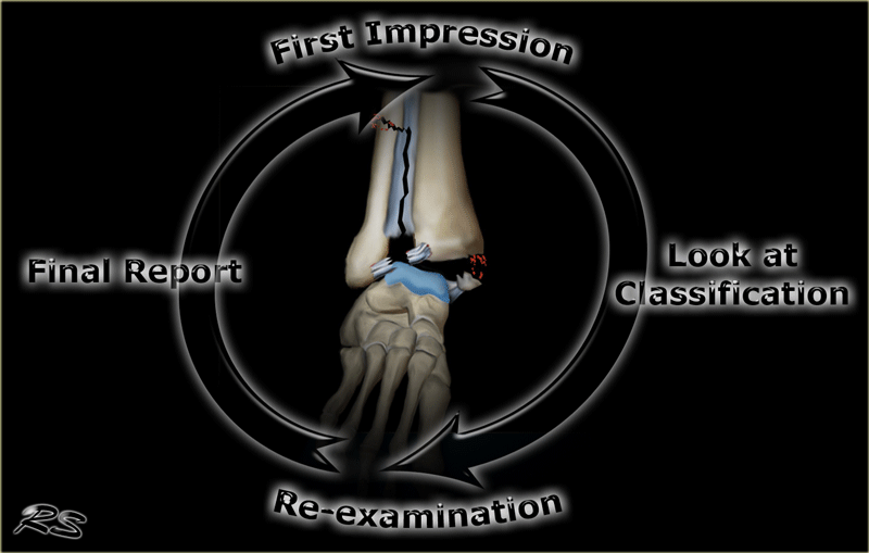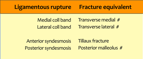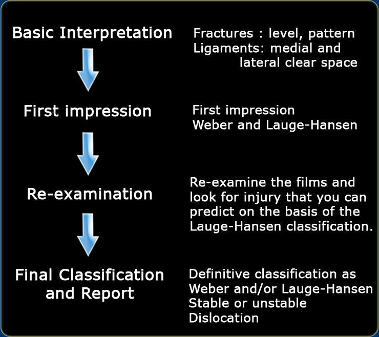 Once you understand the trauma mechanism as described by Lauge-Hansen and the sequence of events that take place in stages, then you know where to look for fractures and ligamentous injuries.