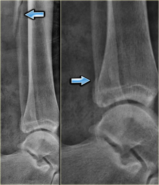 In many cases it is visible on the radiographs of the ankle, but in some cases the fracture is located high and will only be visible on a radiograph of the lower leg.