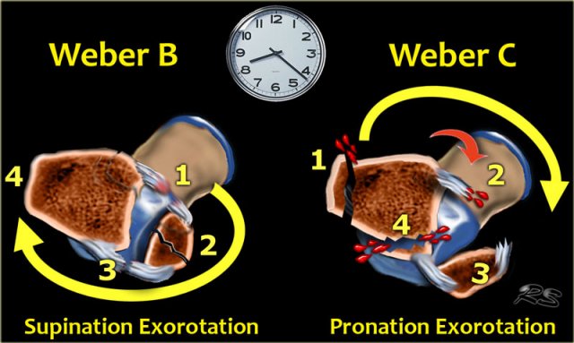 Weber B and C are more difficult and it is essential to understand the sequence of events in these injuries, which are both exorotation injuries.