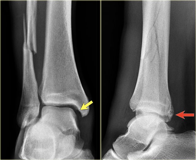 Finally the posterior syndesmotic ligament ruptures, or there is an avulsion of the posterior malleolus, also known as posterior malleolus fracture (red arrow).
