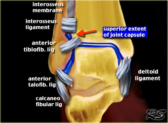 The syndesmosis is the fibrous connection between the fibula and tibia formed by the anterior and posterior tibiofibular ligaments - located at the level of the tibial plafond (French for ceiling) - and the interosseus ligament, which is the thickened lower portion of the interosseus membrane.
