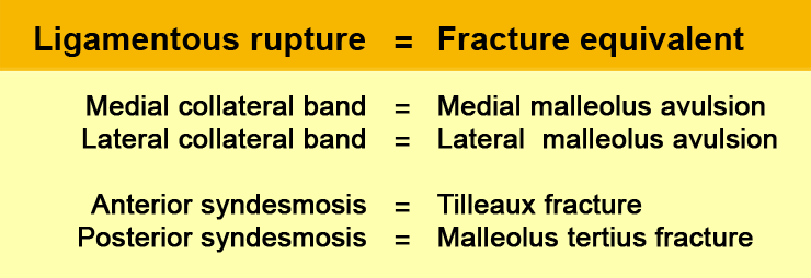 Less commonly the anterior syndesmosis avulses from the tibial attachment - Tillaux fracture.