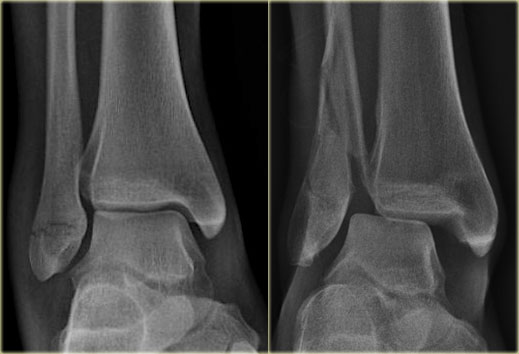 On the left image the lateral malleolus is pushed off by exorotation of the talus.