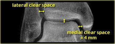 The medial clear space should not exceed 4 mm and is usually equal to the distance between the tibial plafond and the talus.