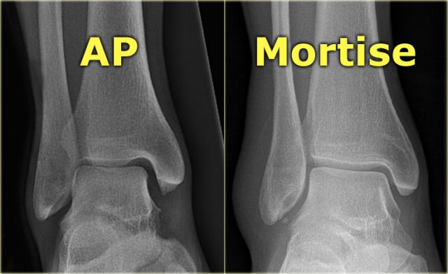 A basic radiographic examination of the injured ankle consists of an AP-view, a Mortise-view and a lateral view.