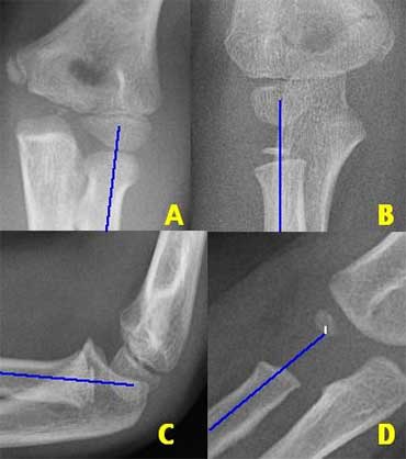 On the left we see, that the radiocapitellar line goes through centre of the capitellum on every radiogragh even though C and D are not well positioned.
