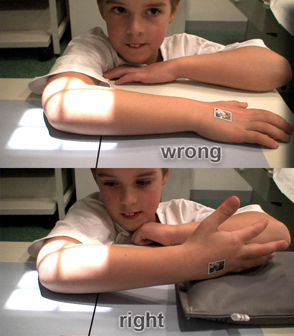 The solution is either to lift the examination table which will lift the elbow or to lower the shoulder by placing the patient on a smaller chair.