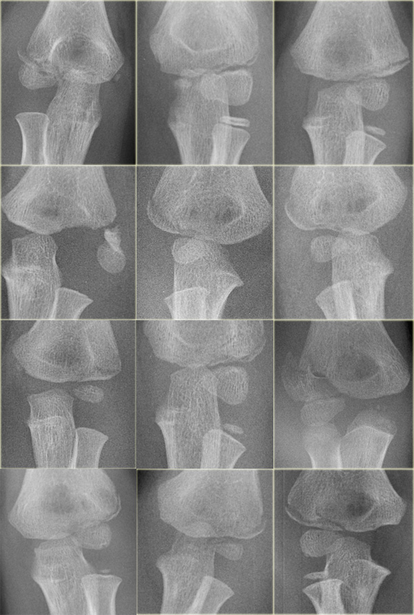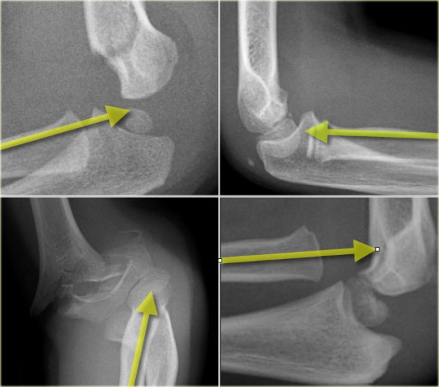 Look especially for the position of the radial epiphysis and the medial epicondyle (figure).