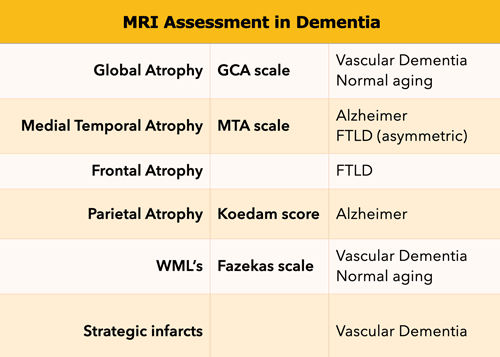 When we study the MR images we must systematically score for global atrophy, focal atrophy and for vascular disease (i.e. infarcts, white matter lesions, lacunes).