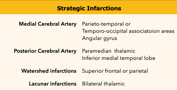 - Strategic infarcts (i.e., infarcts in areas involved in cognition)