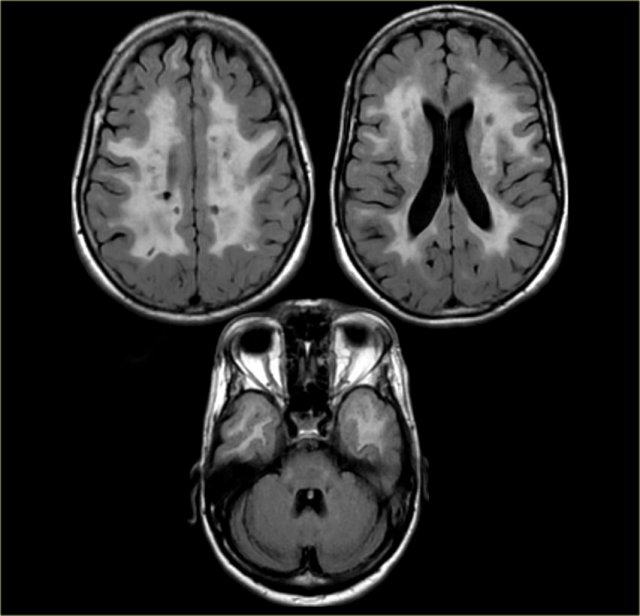 In addition, FLAIR will reveal moderate to sever white matter hyperintensities (Fazekas grade 2 or 3)