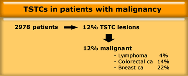In a patient with a known malignancy a single TSTC lesion can also be assumed to be benign.
