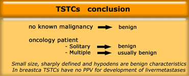 In patients with breastcancer and no known livermetastases at presentation, these TSTC lesions have no positive predictive value for the development of livermetastases in the long term.