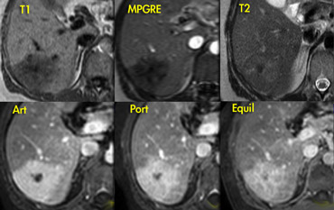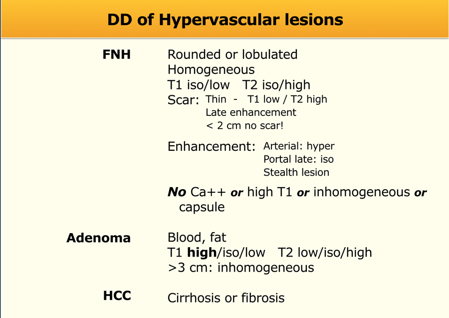 In FNH not all features have to be present, but there should be no calcification or high signal intensity on T1WI and the lesion should not be inhomogeneous or have a capsule.