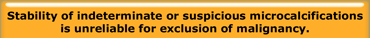 On the other hand in a retrospective study that included indeterminate and suspicious clusters of microcalcifications, stability could not be relied on as a reassuring sign of benignancy (3).
