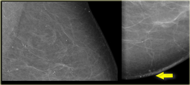 First notice that there are some calcifications that are clearly located within the skin (arrows).