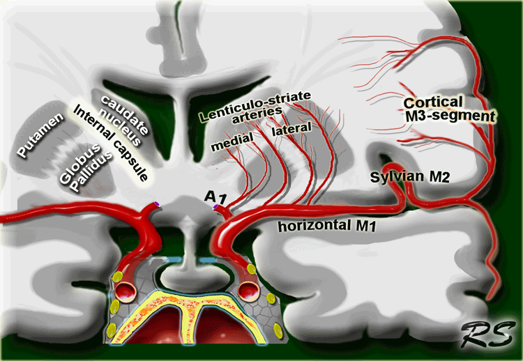 Notice that the medial lenticulostriate arteries arise from the A1-segment of the anterior cerebral artery. - Sylvian M2-segment