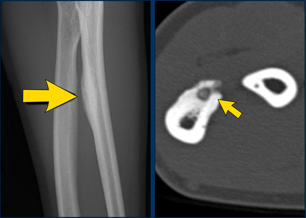 Osteoid osteoma is located within the cortex and needs to be differentiated from osteomyelitis. - Juxtacortical