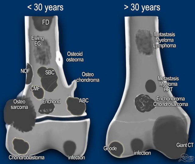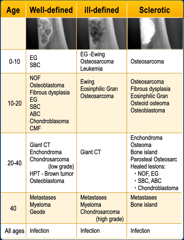 Once we have decided whether a bone lesion is sclerotic or osteolytic and whether it has a well-defined or ill-defined margins, the next question should be: how old is the patient?