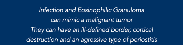 Infections and eosinophilic granuloma are exceptional because they are benign lesions which can mimick a malignant bone tumor due to their aggressive biologic behavior.