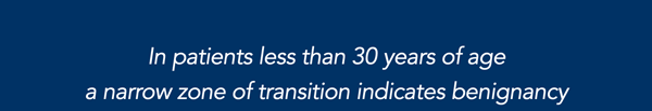 The most reliable indicator in determining whether these lesions are benign or malignant is the zone of transition between the lesion and the adjacent normal bone (1).