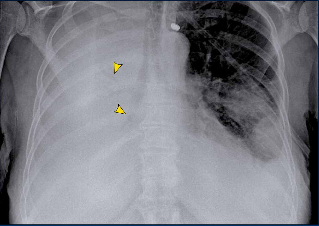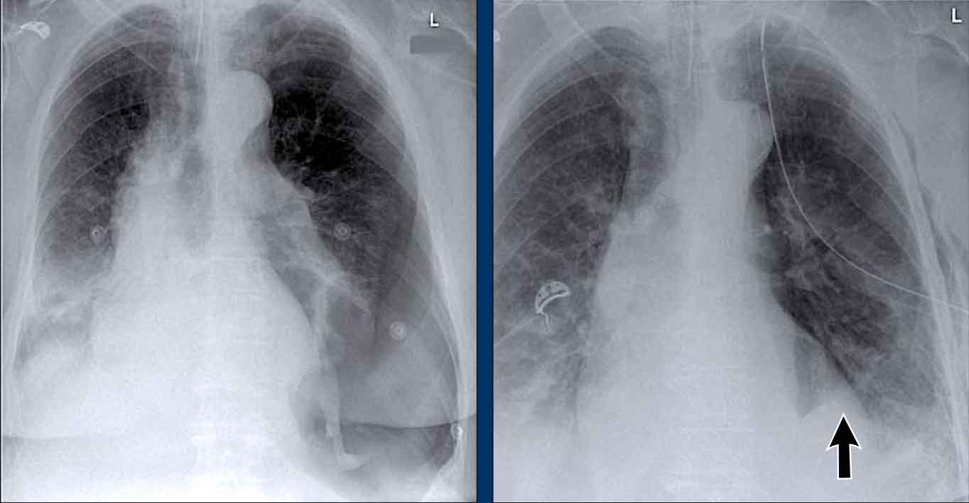 Post–chest tube insertion, the diaphragm returns to normal position (arrow(), confirming decompression.
