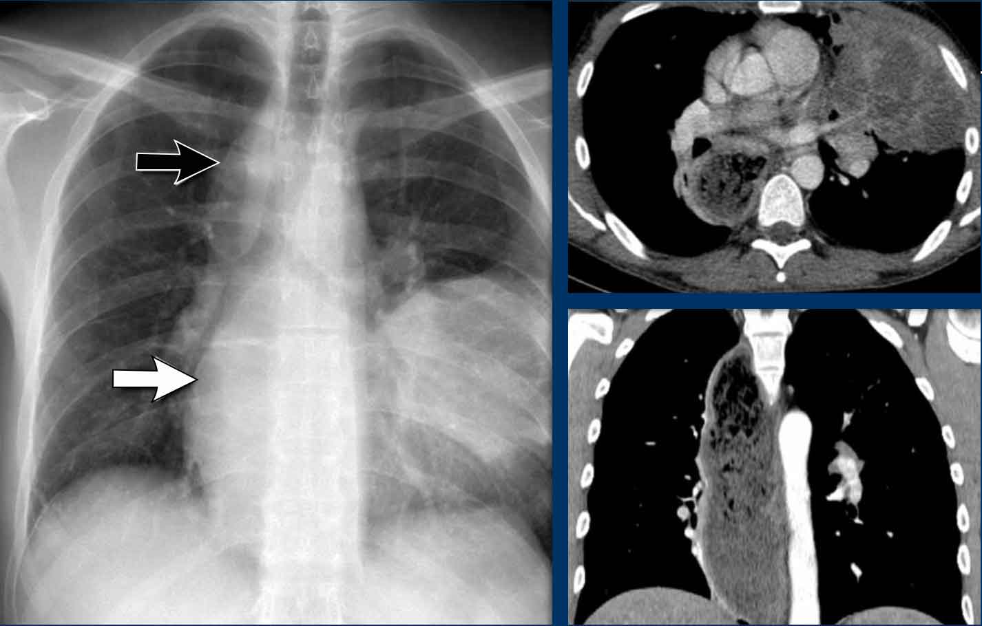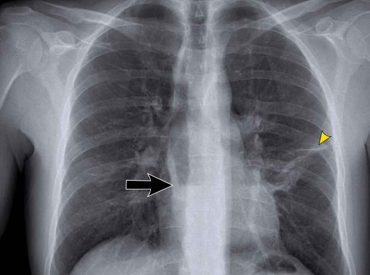 - Widening of the right paratracheal stripe (>2–3 mm) may indicate lymphadenopathy, pleural thickening, hemorrhage, fluid overload, or congestive heart failure.