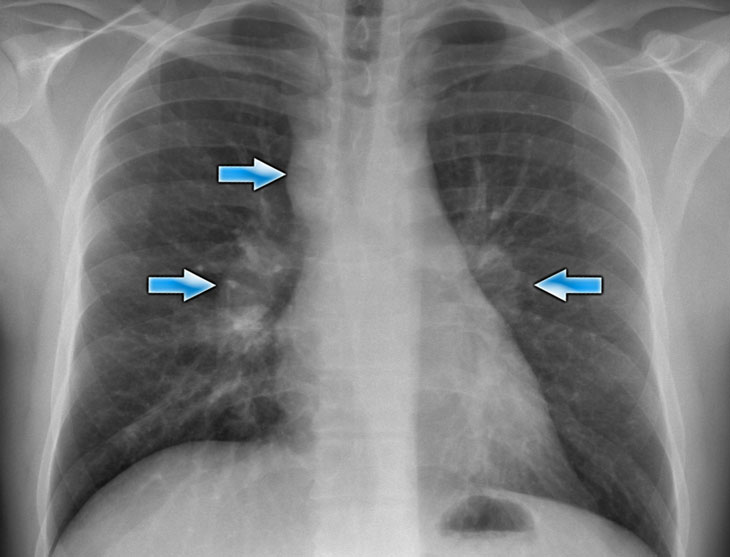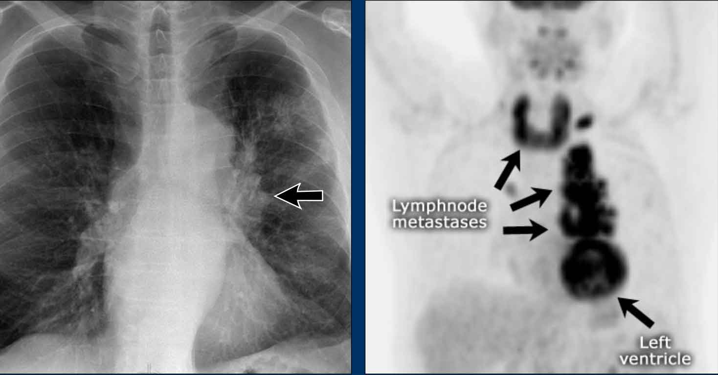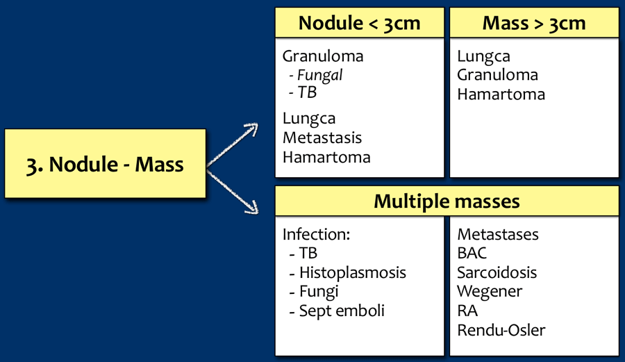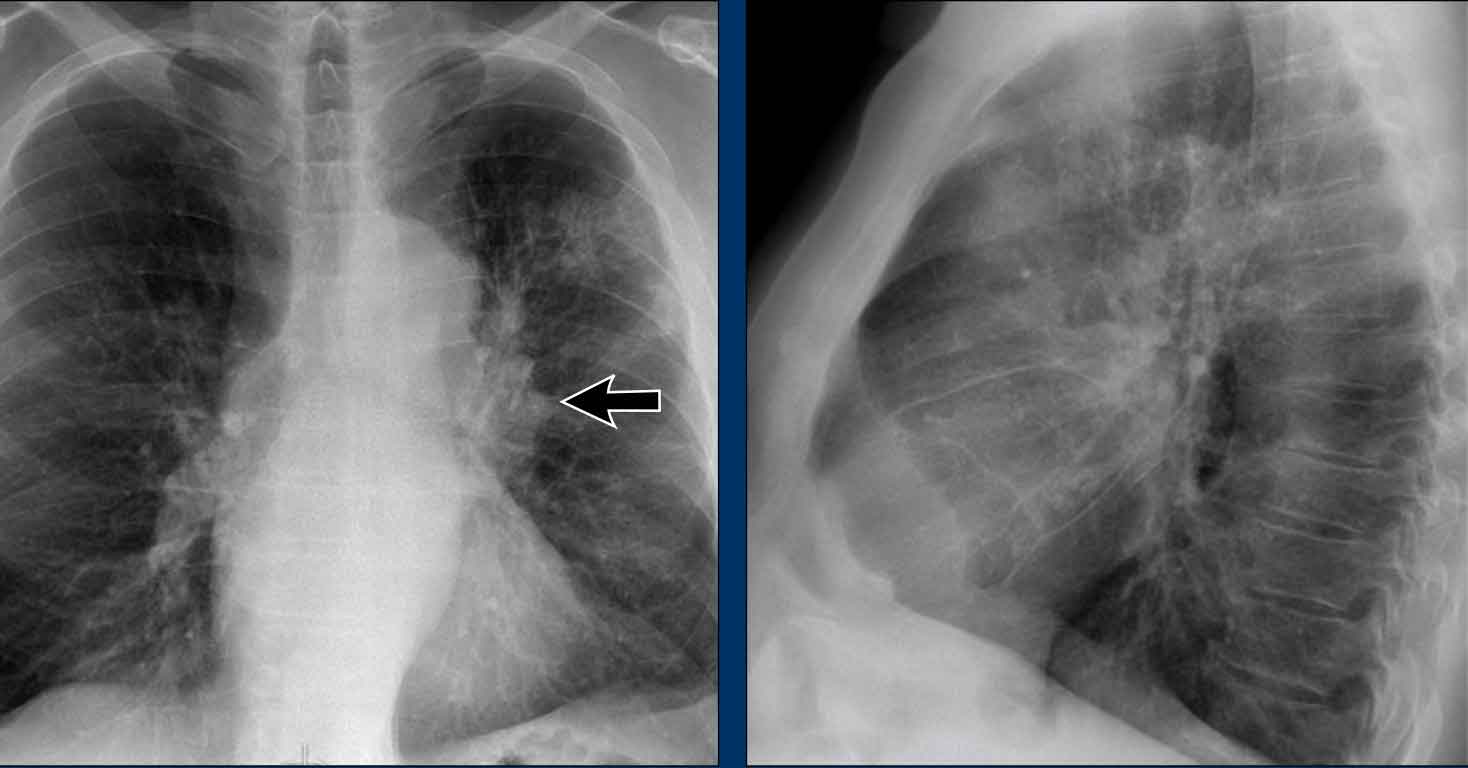 - On the lateral view, the presence of rounded opacities in regions where pulmonary vessels are not normally seen strongly suggests enlarged lymph nodes.