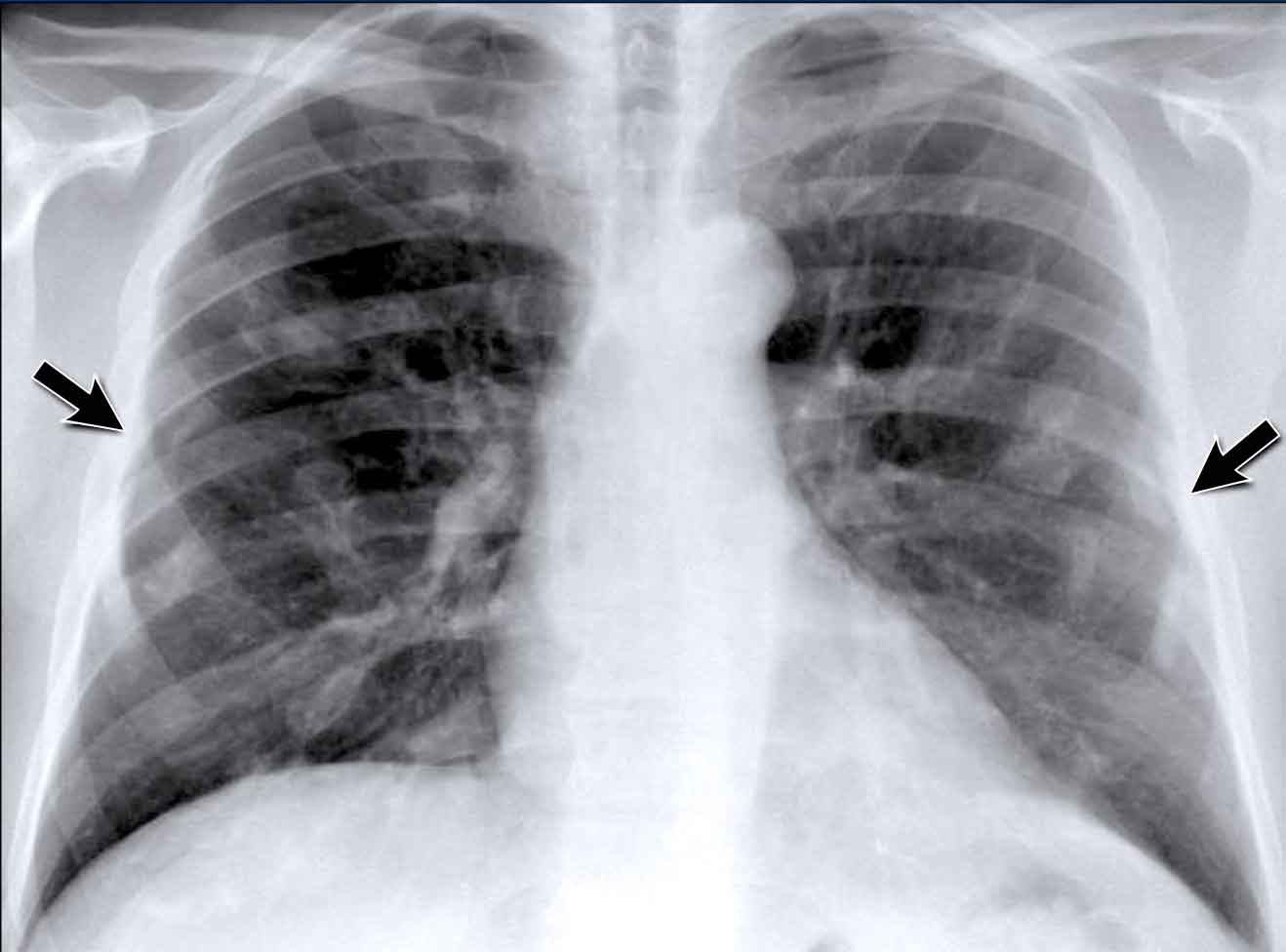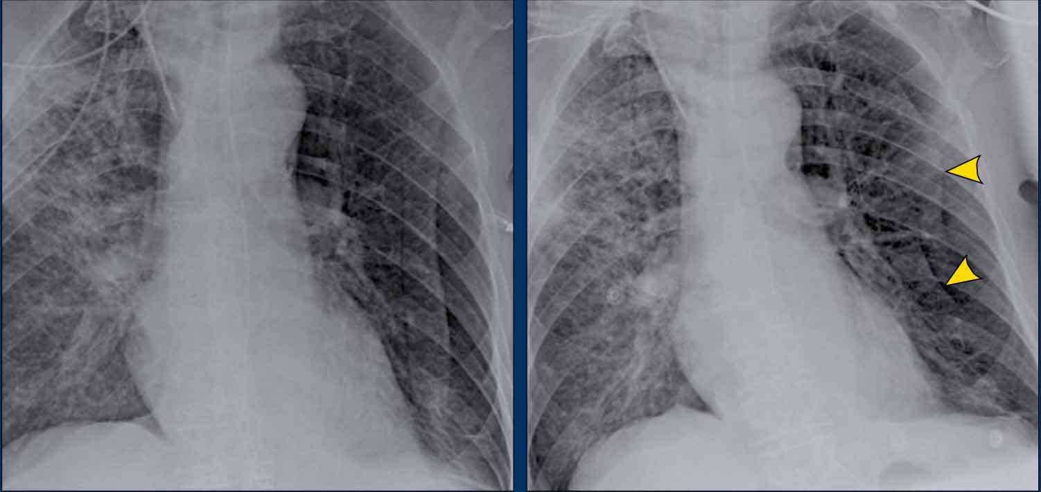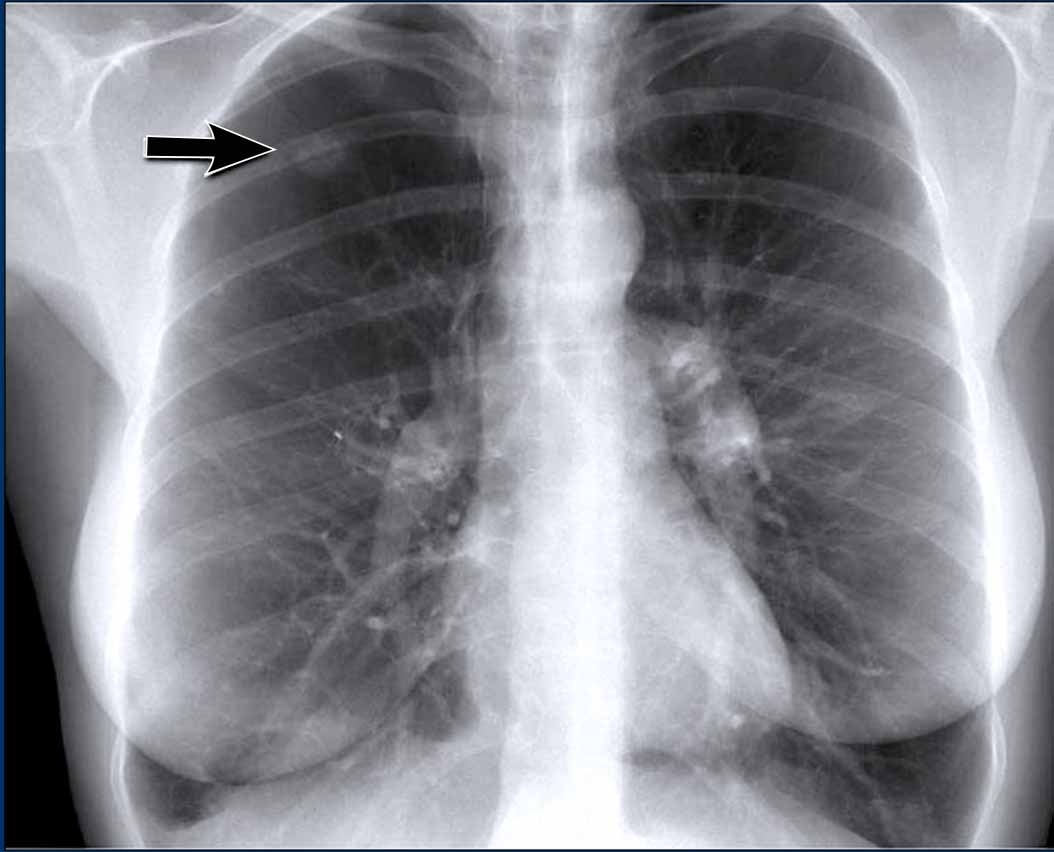 - Chest X-ray shows a retracted visceral pleura (blue arrow), consistent with pneumothorax.