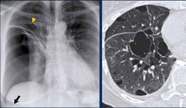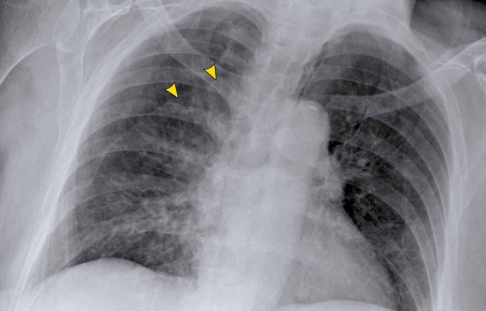 - Lung cyst in the right upper lobe (yellow arrowhead)
