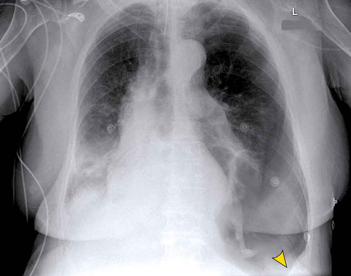 - Air-fluid level (hydropneumothorax) (black arrow)