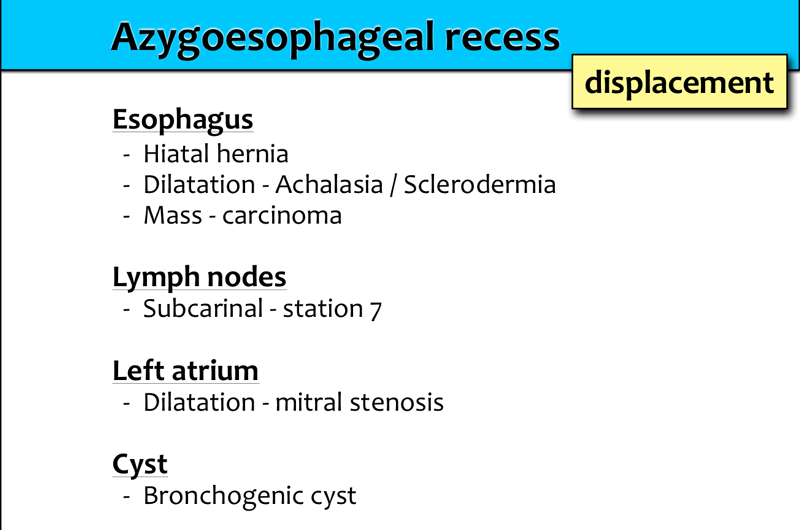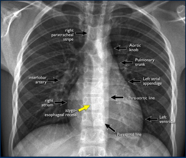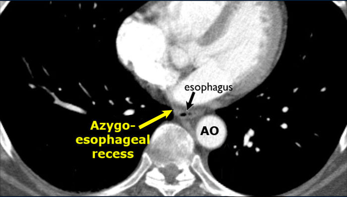 A key mediastinal–pulmonary interface to assess is the azygoesophageal recess (yellow arrow).