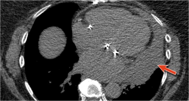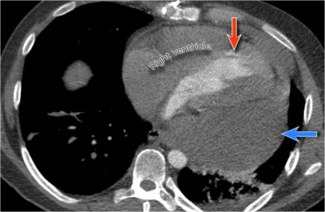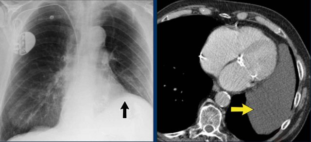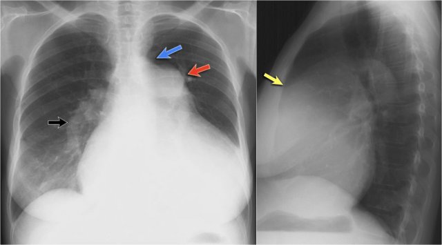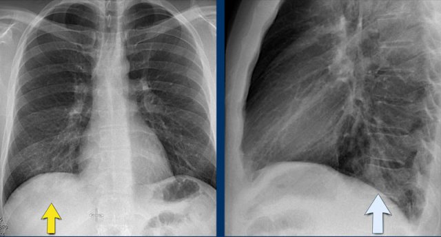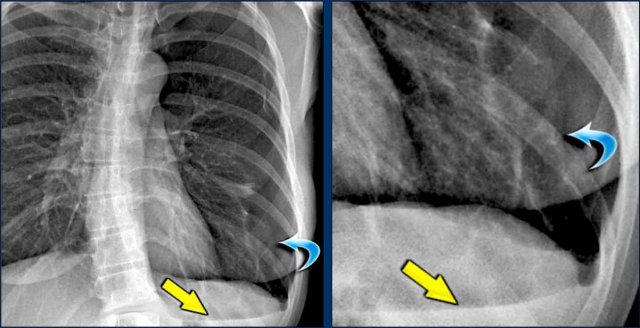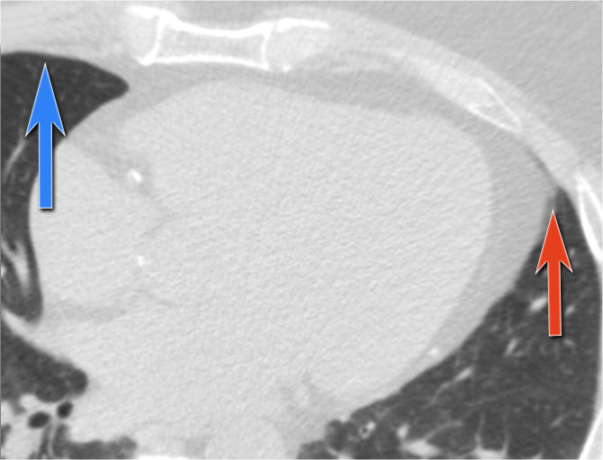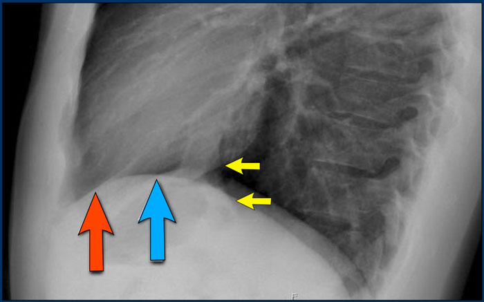 - The left hemidiaphragm is usually visible only up to the point where it is adjacent to the cardiac silhouette (blue arrow), beyond which the interface is lost due to the similar radiodensity of the heart and upper abdominal contents.