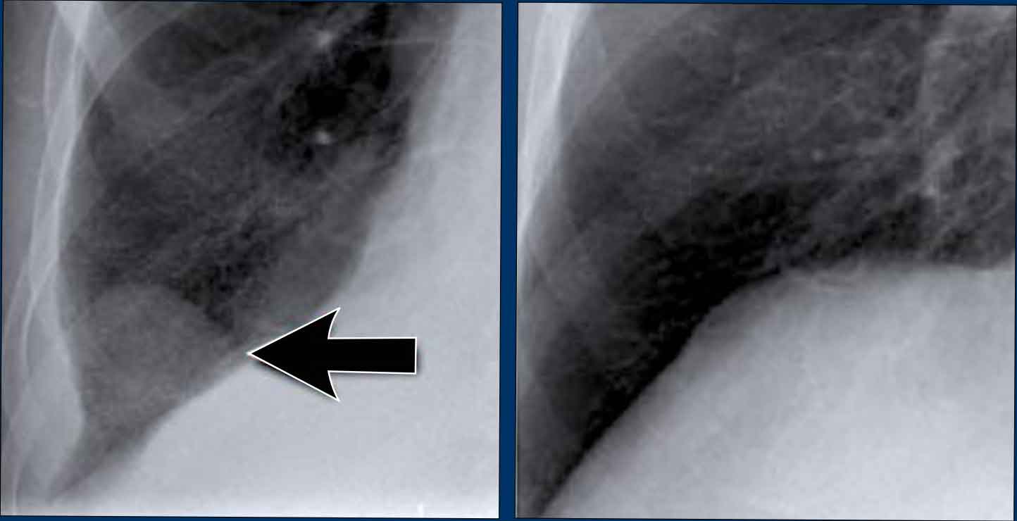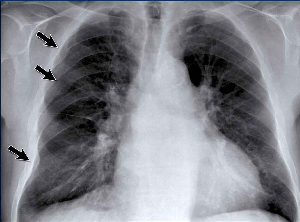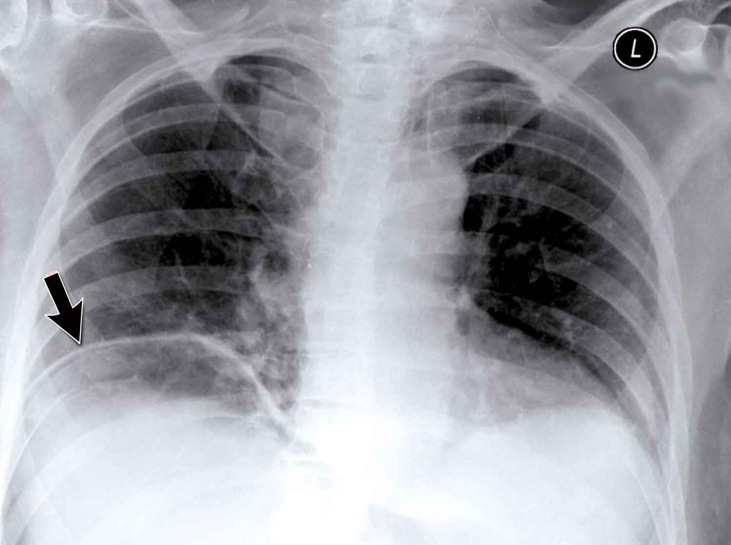 - A thin, well-defined diaphragmatic contour is visible (arrow), differentiating it from plate-like atelectasis, which may mimic this appearance in cases of suboptimal inspiration.