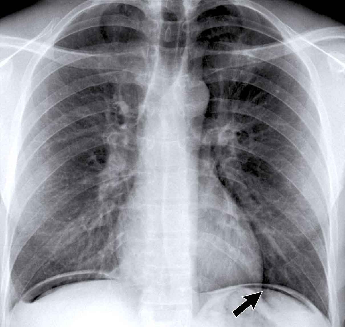 - Differential includes postoperative pneumoperitoneum, which may persist for several days after abdominal surgery.