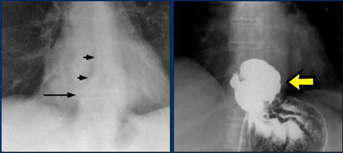 - A Bochdalek hernia is a common incidental finding in adults and results from a posterior diaphragmatic defect(arrows).