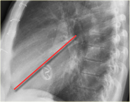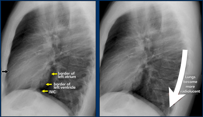 When evaluating the vertebral bodies on the lateral view, they should appear progressively more radiolucent (darker) from top to bottom due to the increasing amount of aerated lung overlying them (white arrow).