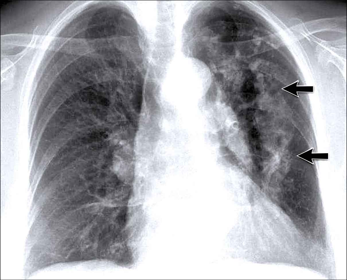 The radiograph demonstrates multiple rib deformities consistent with old fractures (arrows).