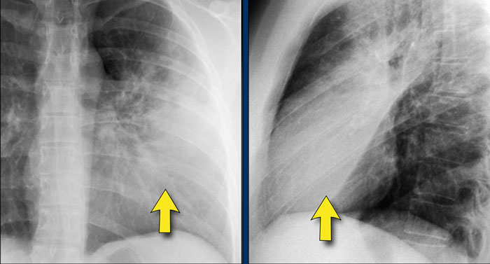 This appearance can mimic right middle lobe consolidation or atelectasis due to loss of the normal silhouette (silhouette sign).