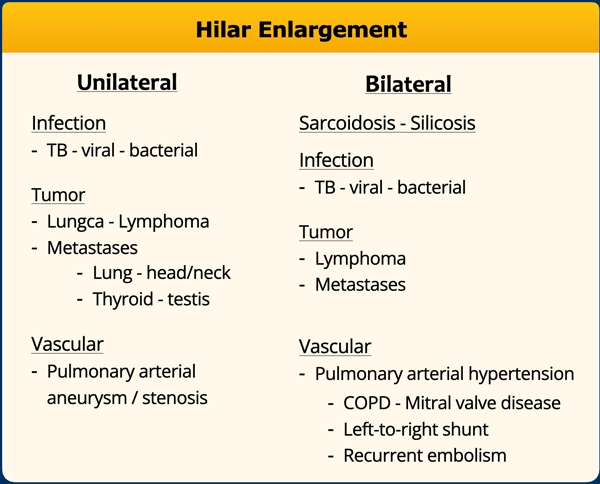 - On the PA view, hilar enlargement may be noted, but it can be difficult to differentiate between vascular dilatation and lymphadenopathy.
