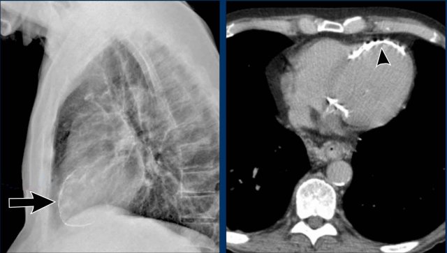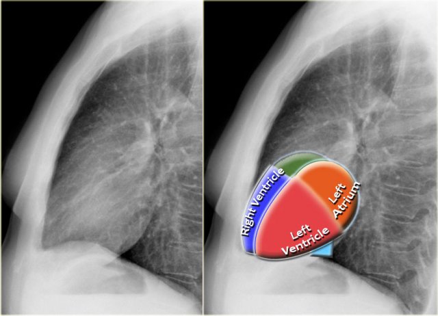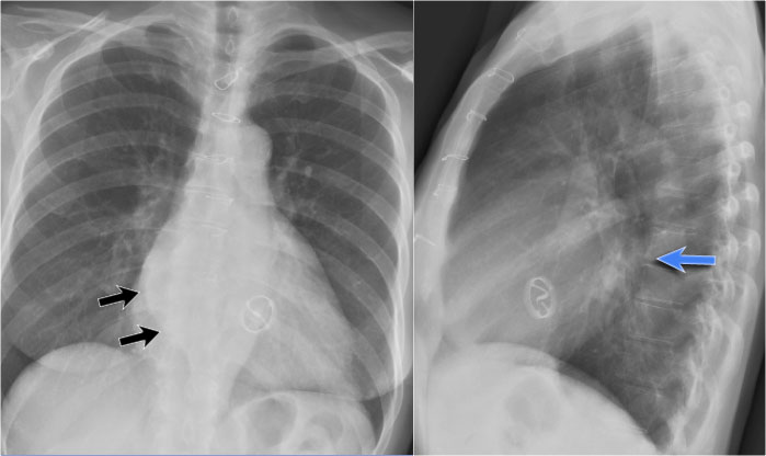 The retrosternal space normally contains aerated lung and should therefore appear radiolucent (dark on the radiograph), extending inferiorly to the level where the right ventricle contacts the sternum (small black arrow).