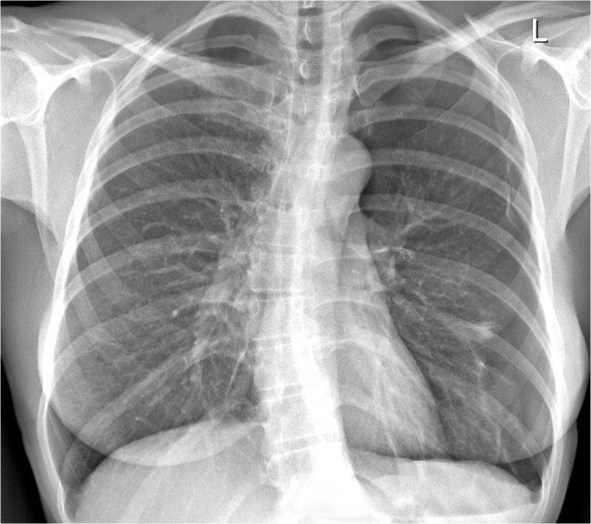 - Inspect the mediastinal contours for widening, masses, or abnormal silhouettes.