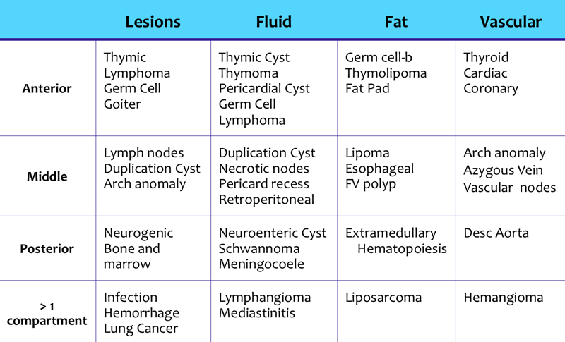 - A soft tissue density in the retrosternal space narrows the differential diagnosis to anterior mediastinal masses, commonly remembered as the "4 Ts":