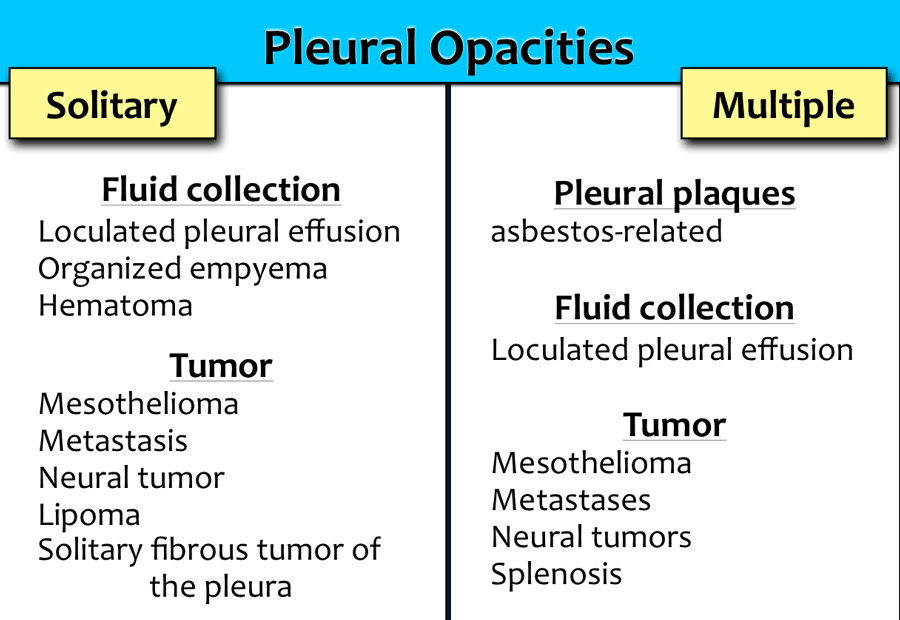 - Encysted pleural effusions may become trapped within the fissures, often mimicking a mass.