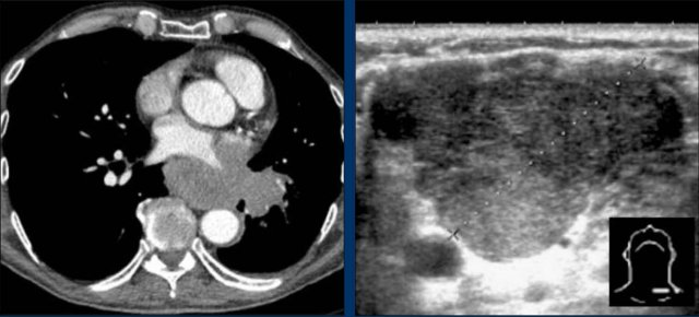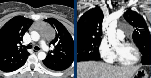 - It is located anteriorly, often presenting as a right-sided retrosternal mass.
