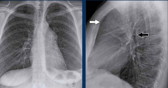 A lateral chest radiograph is particularly useful in such cases to confirm the diagnosis.