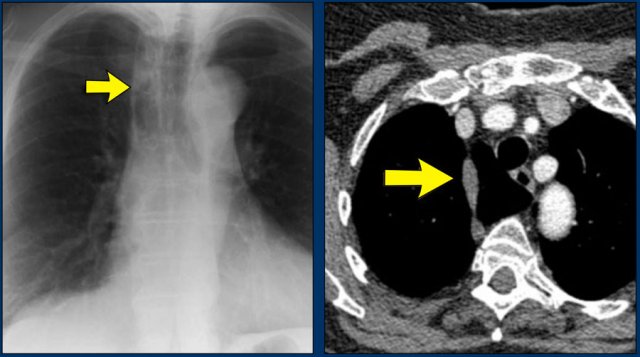 Additionally, note the widened paratracheal stripe, another indicator of mediastinal lymphadenopathy.