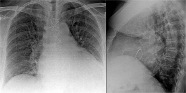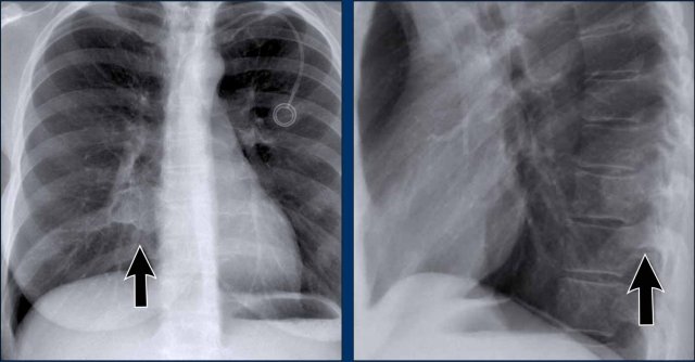 - Any opacity in the region of the vertebral bodies should prompt correlation with the PA view to assess for spondylotic osteophytes, which are typically located on the right side.