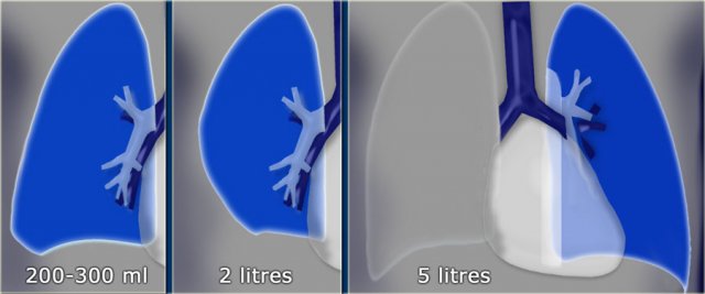 - Air bronchogram in the right main bronchi (arrowheads), indicating compression atelectasis of the lung due to massive effusion.