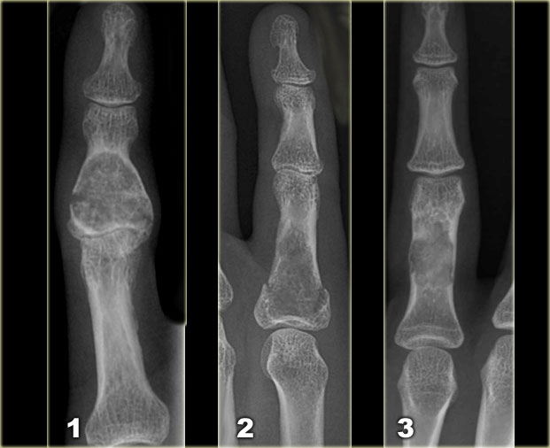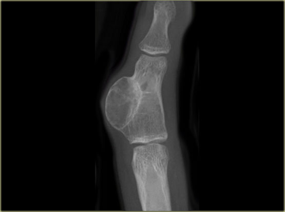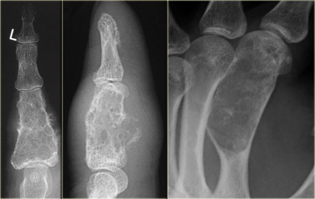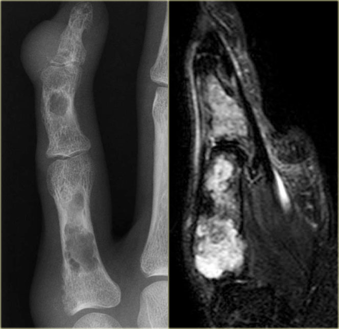 On the left images of an aneurysmal or expansile well-defined osteolytic bone lesion in the proximal phalanx.